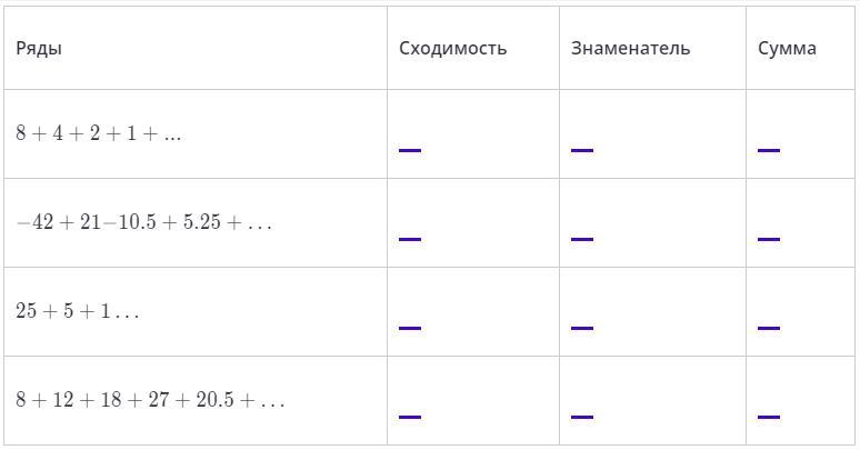 Для каждого из следующих рядов определите, сходящийся ли он или нет, и для тех, которые являются сходящимися, найдите сумму. Введите дефис, если нет ответа. В поле "Сходимость" необходимо вписать "Да" или "Нет".