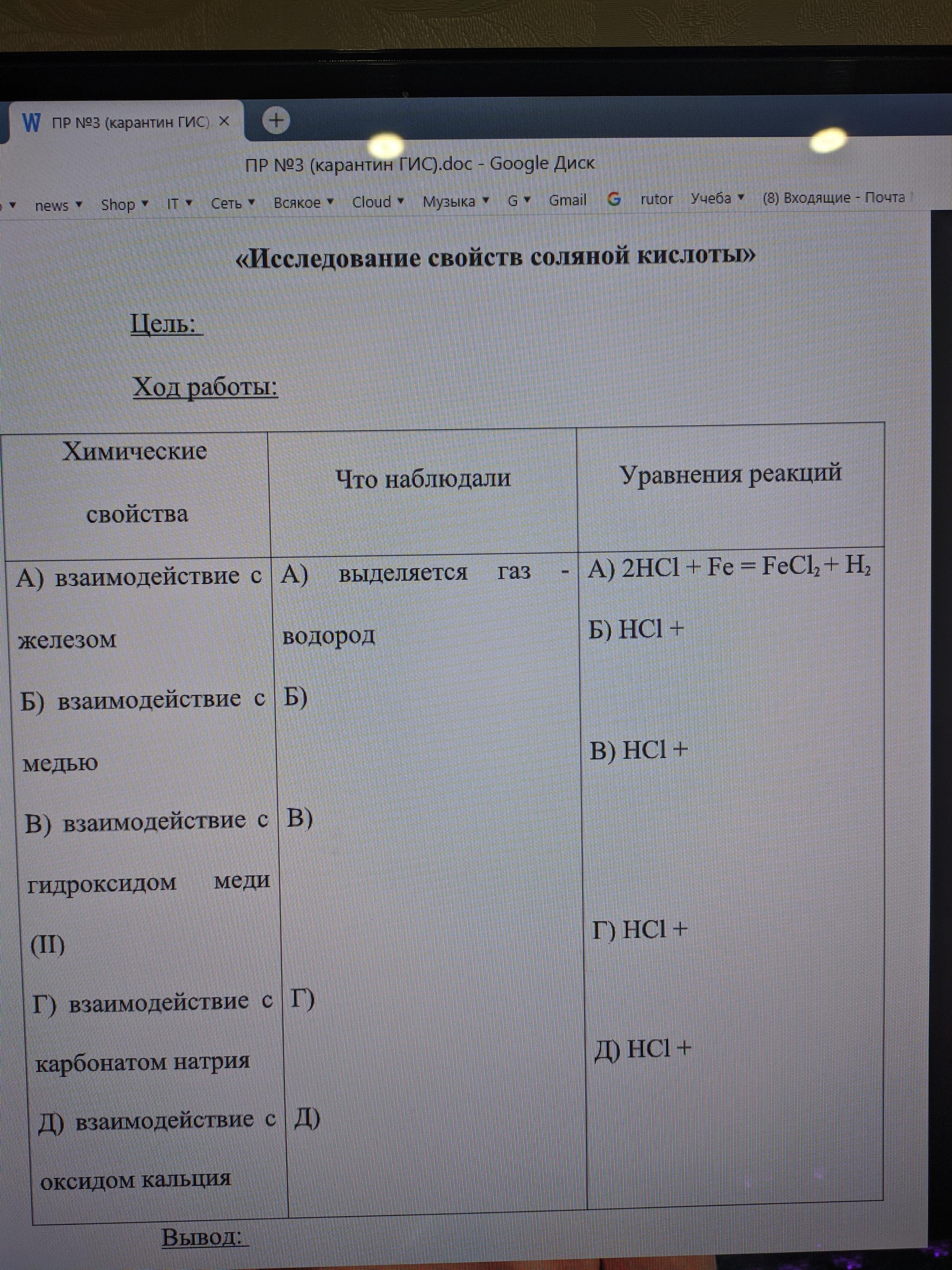 Б)реакция при обычных условиях не протекает,но при температуре и и газообразным HCl реакция идёт с выделением водорода и образованием соли CuCl2(в рамках 9 класса не помню чтоб проходили такое)