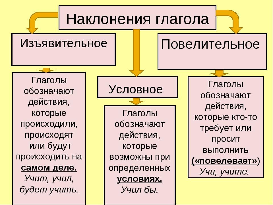 Наклонения глагола (всего их три): изъявительное,условное,повелительное.