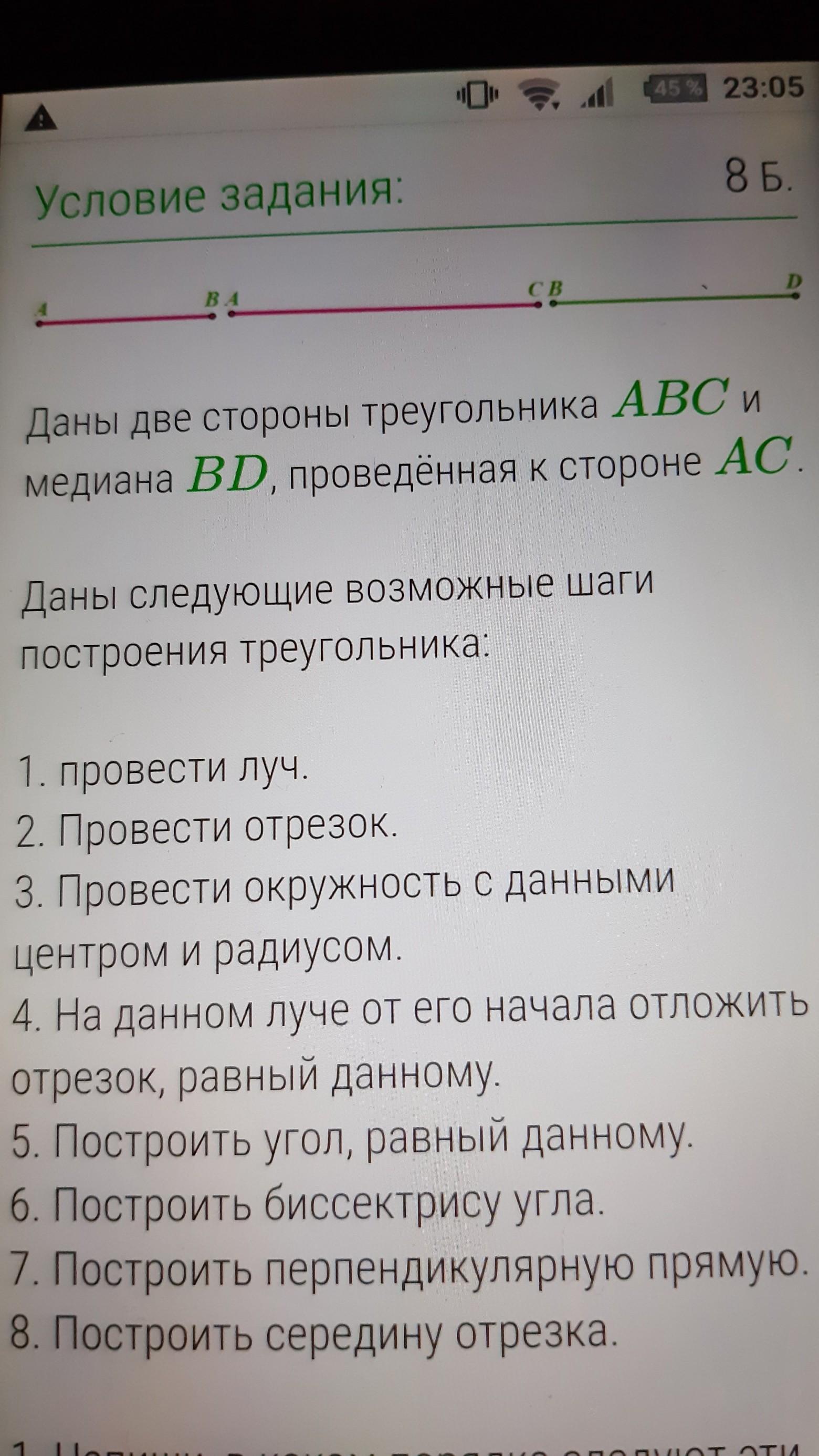 геометрия помогите решить Надо написать в каком порядке следуют эти шаги в задаче.(один и то же шаг может повторяться .И второй вопрос .У этой задачи 1.всегда одно решение.2 Может не быть решения. 3 Иногда может быть два решения.
