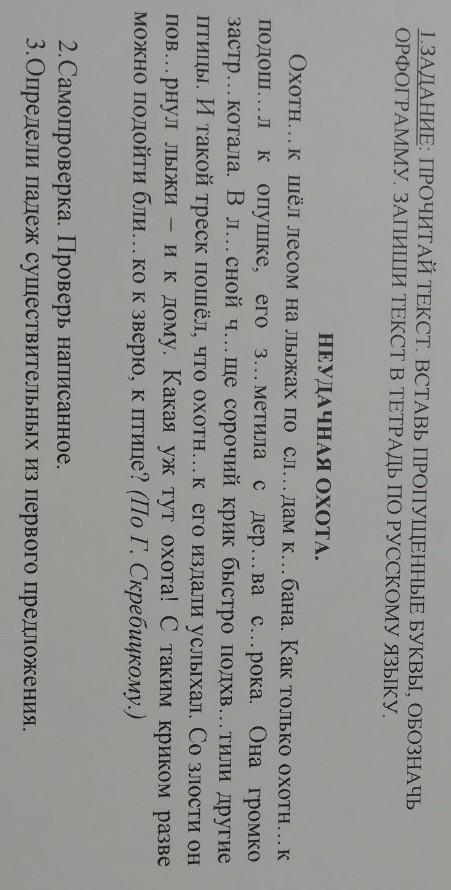 Охотник шёл на лыжах по следам стада кабана.Охотник подошёл к опушке,его сразу заметила с дерева сорока. Она громко застрекотала. В лесной чаще сорочий крик быстро подхватили другие птицы. И такой треск пошёл, что охотник издали его услыхал. Со злости он повернул лыжи – и домой. Какая уж тут охота! С таким криком разве можно подойти близко к зверю?