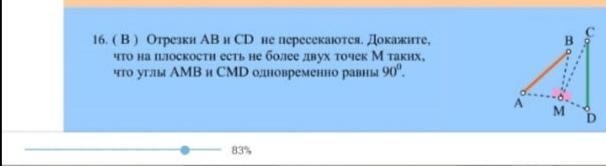 отрезки ab и cd не пересекаются, докажите что на плоскости есть не более двух точек М таких что углы AMB и CMD одновременно равны 90 градусам