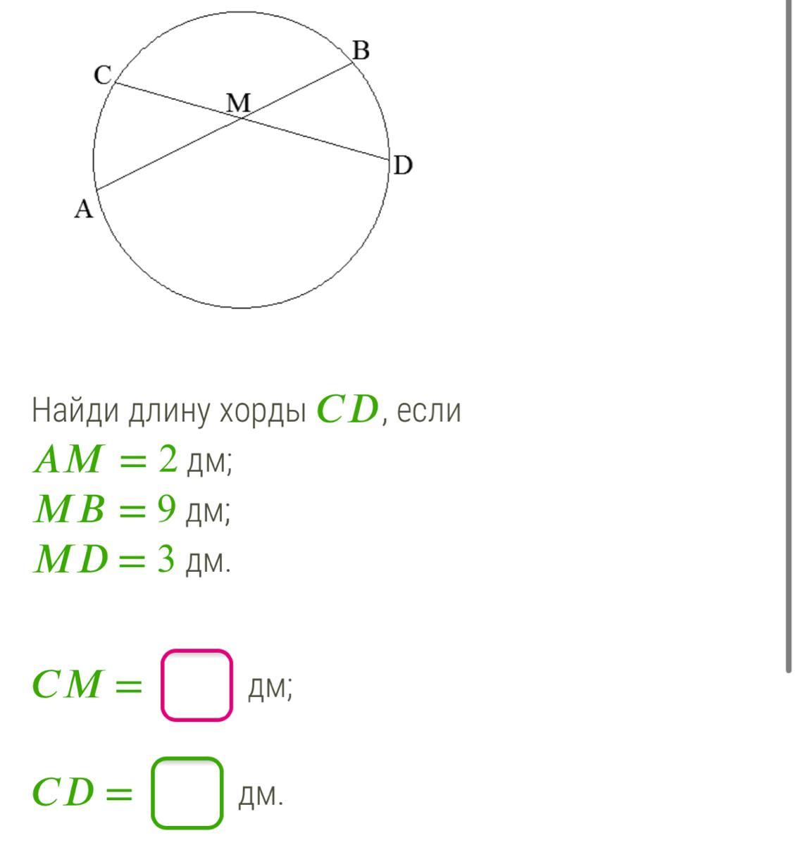 СМ=АМ*МВ:МД; СМ=2*9:3=6 (дм); СД=СМ+МД=6+3=9 (дм).