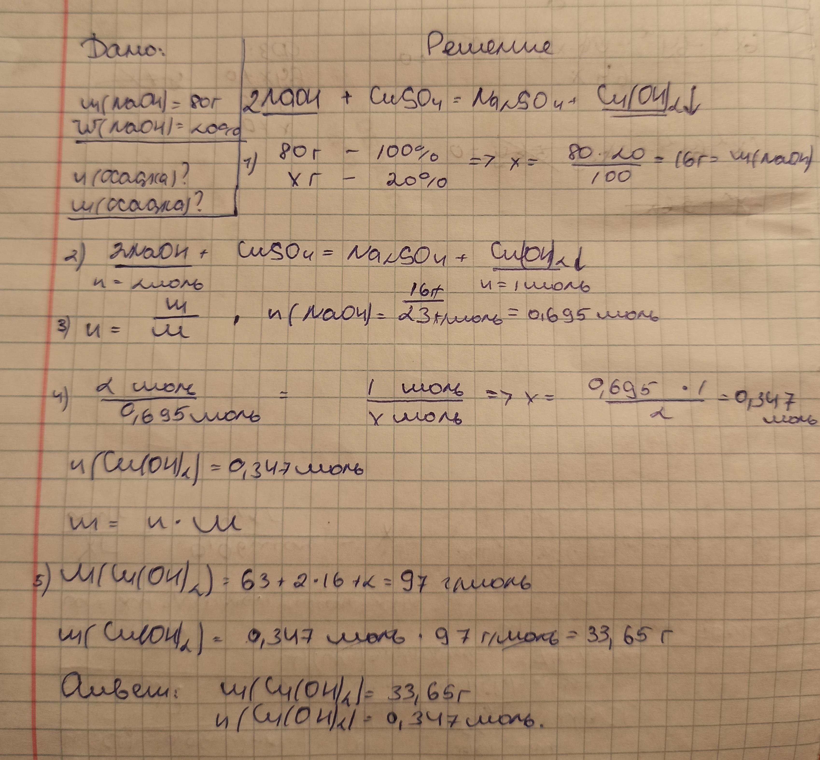 визначіть масу та кількість речовини осаду, який утвориться при дії 80г 20% розчину натрій гідроксиду на розчин купрум (||) сульфату
