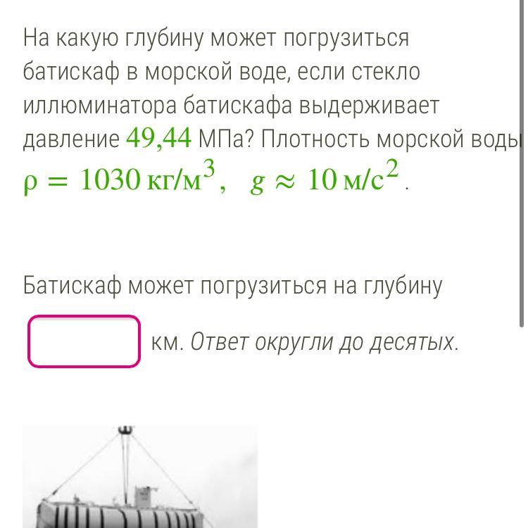 h = Р/ρg = 49440000/(1030*10) = 4800 м = 4,8 км