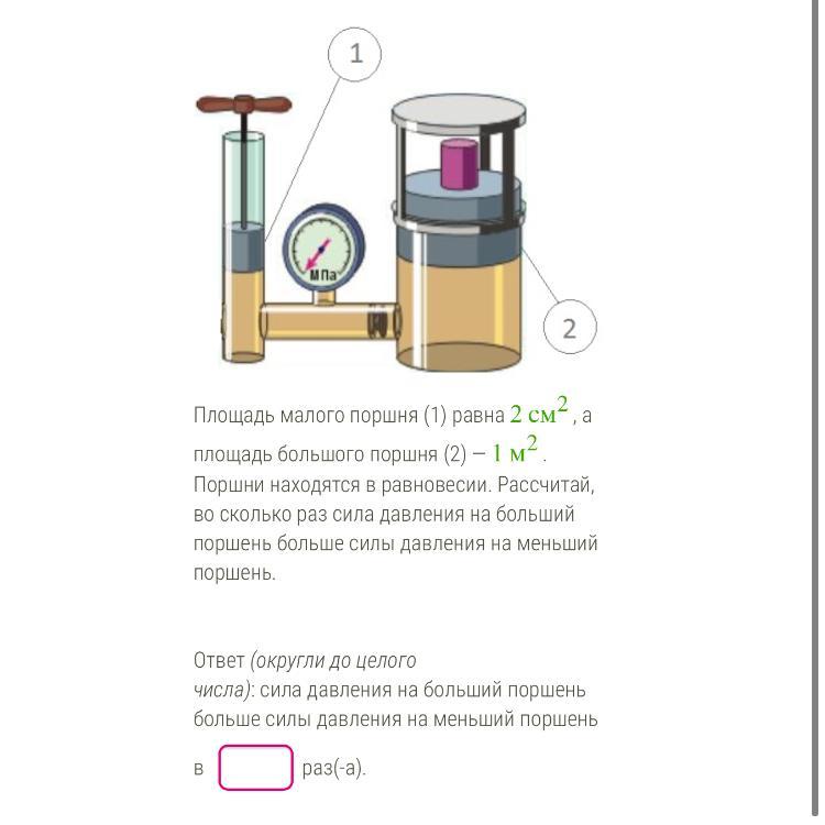 2)Площадь меньшего поршня гидравлического пресса равна 8 см2. На него действует сила 200Н. Площадь большего поршня — 150 см2. Вычисли, какая сила действует на больший поршень.