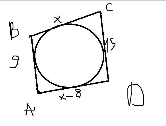Четырёхугольник АВСD описан около окружности, причём АВ = 9 см, CD = 15 см, сторона АD на 8 см меньше, чем сторона ВС. Найдите сторону ВС. Ответ дайте в сантиметрах.