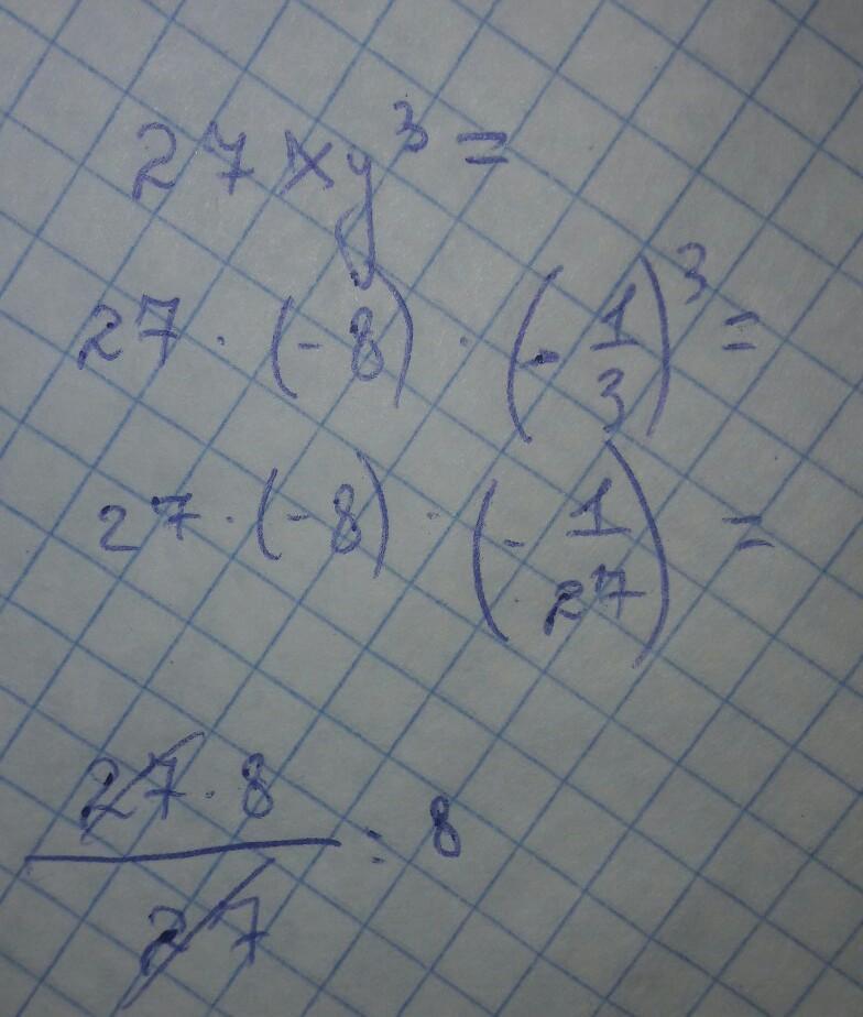 Выберите верный вариант ответа. Найдите значение выражения 27xy3 при х = – 8, у = -1/3 .
