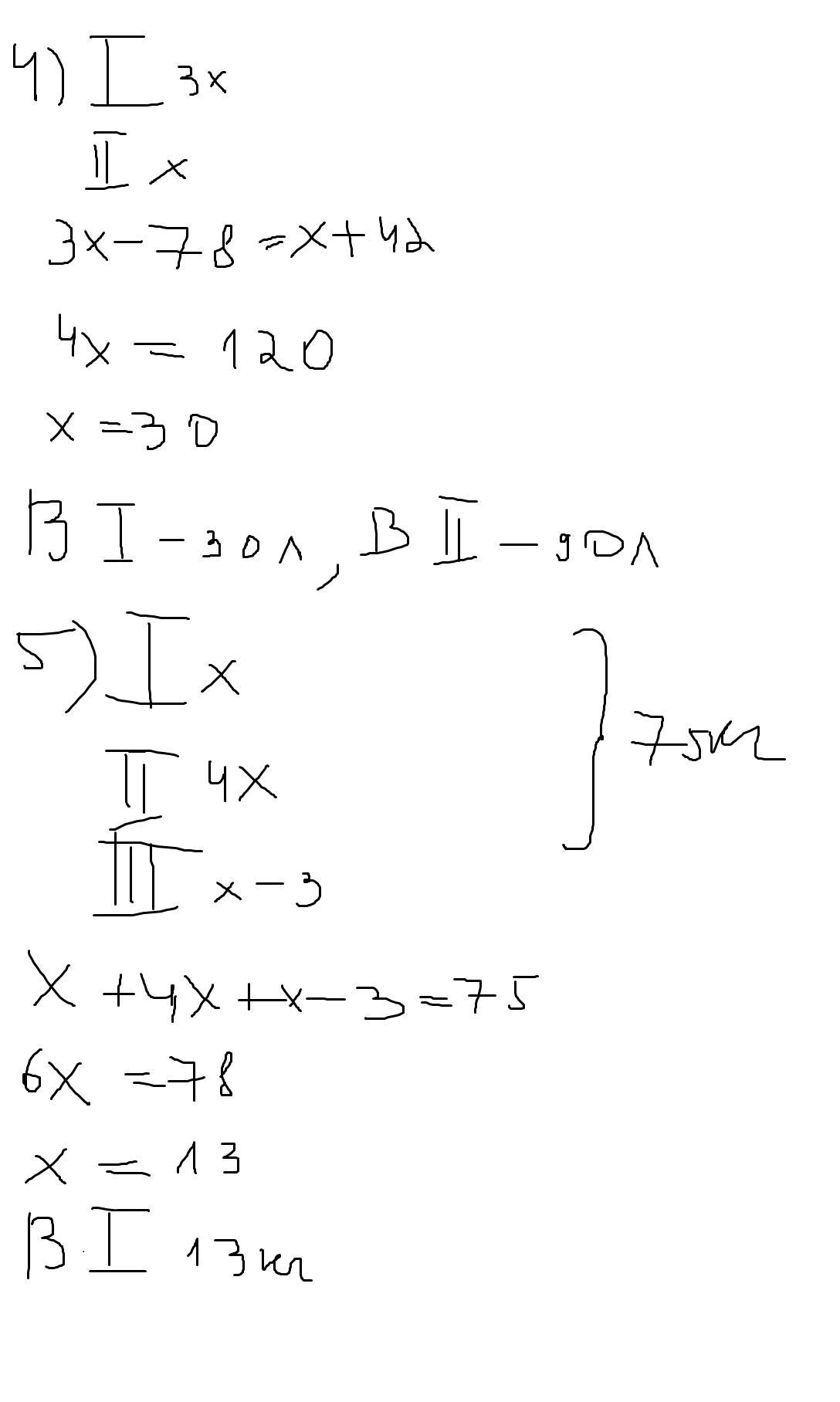 4. В одной бочке в 3 раза больше бензина, чем в другой. Если из первой бочки отлить 78 л бензина, а во вторую добавить 42 л, то бензина в бочках будет поровну. Сколько бензина было в каждой бочке?