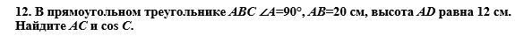 12. В прямоугольном треугольнике АВС А=90°, AB=20 см, высота AD равна 12 см. Найдите AC и cos C. фото в вопросе