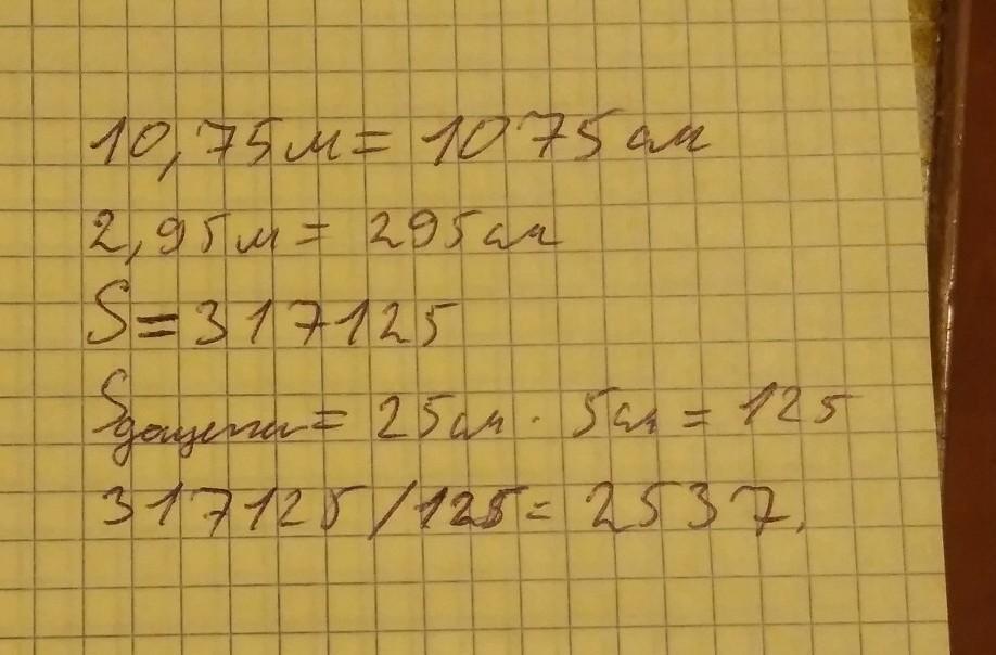 Пол комнаты, который имеет форму прямоугольника со сторонами 10,75 м и 2,95 м, необходимо покрыть паркетом прямоугольной формы. Длина дощечки паркета равна 25 см, а ширина — 5 см.