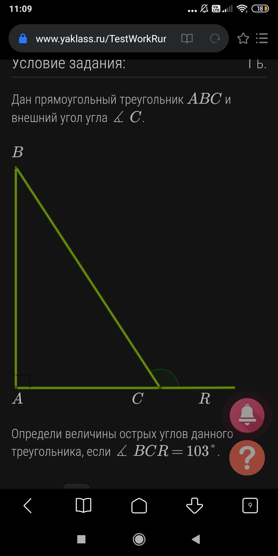 определи велечины острых углов данного треугольника ,если угол BCR = 103°