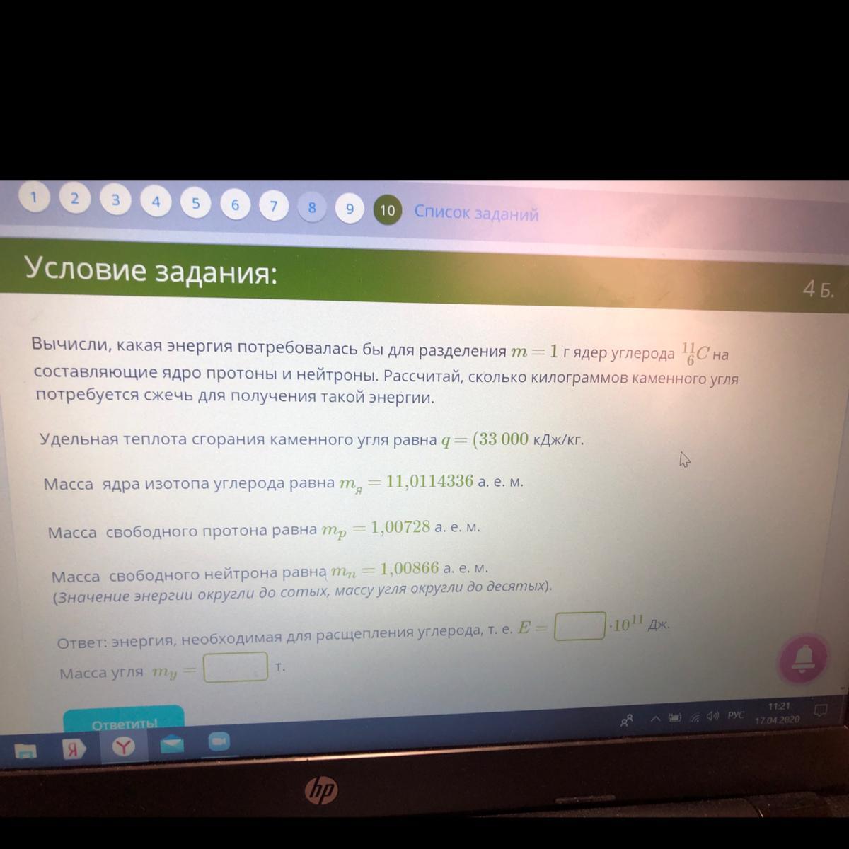 6 на составляющие ядро протоны и нейтроны. Рассчитай, сколько килограммов каменного угля потребуется сжечь для получения такой энергии.