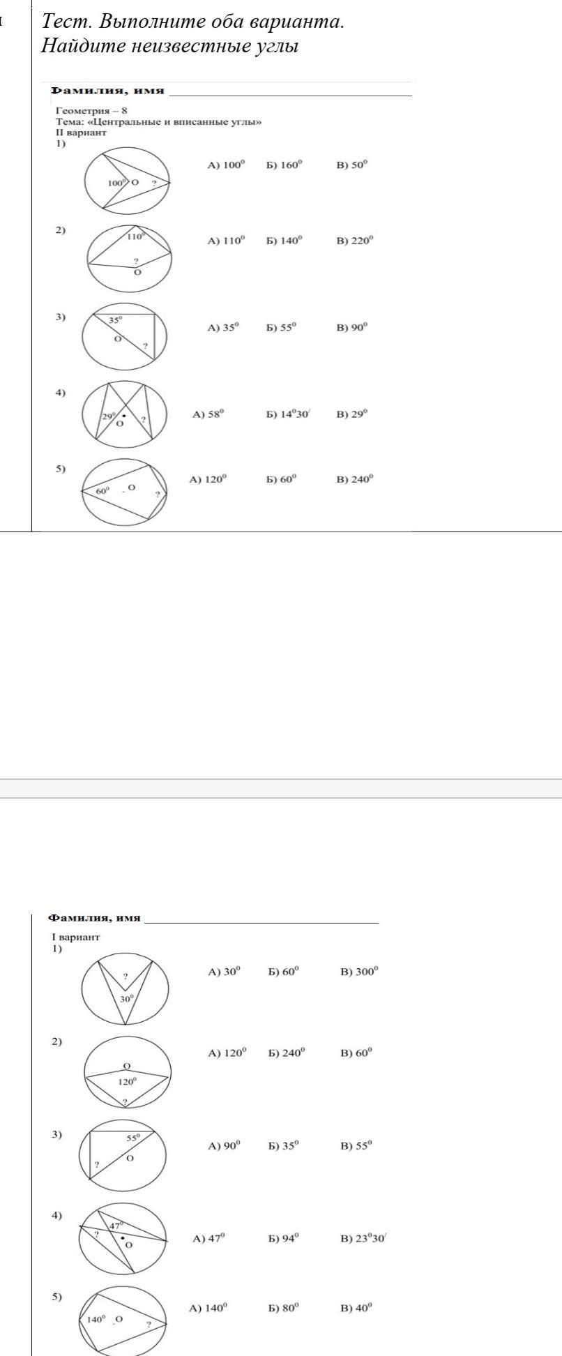 центральные и вписанные углы решите оба варианта