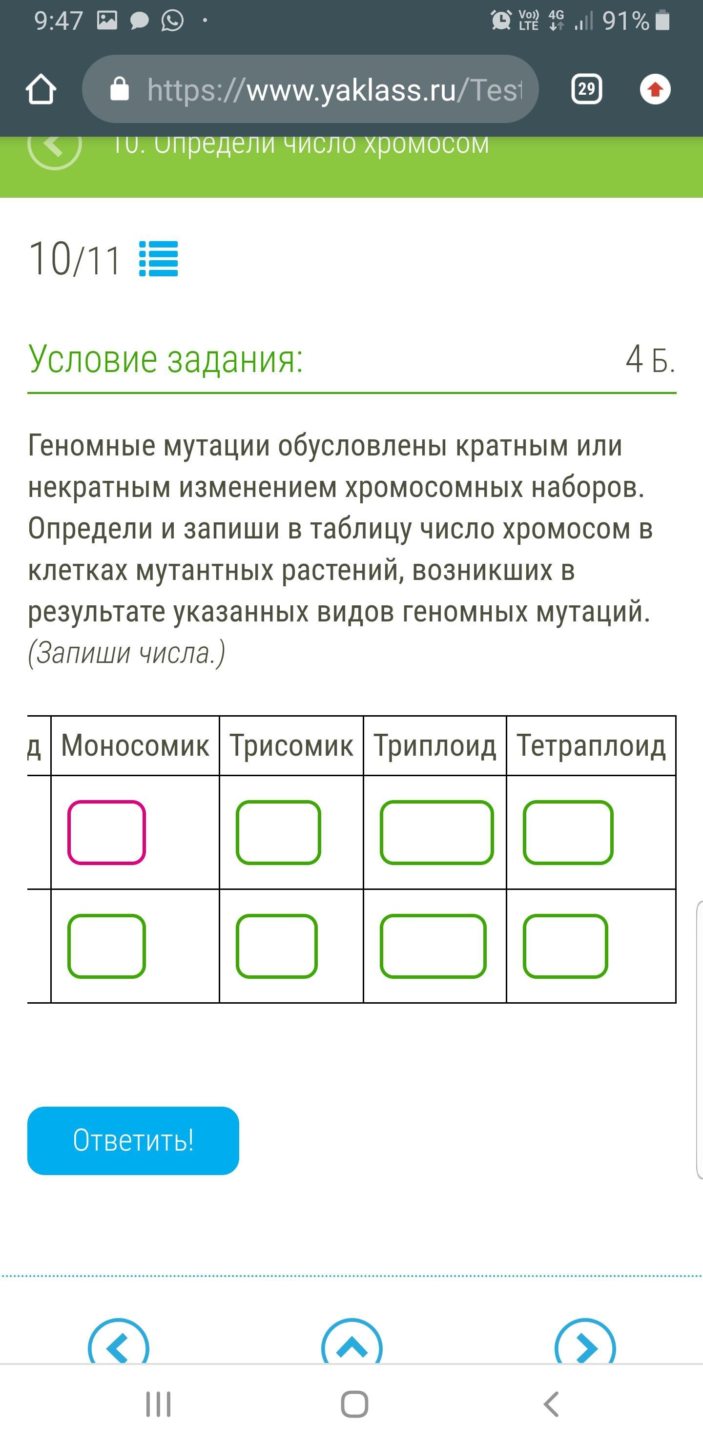 Геномные мутации обусловлены кратным или некратным изменением хромосомных наборов. Определи и запиши в таблицу число хромосом в клетках мутантных растений, возникших в результате указанных видов геномных мутаций