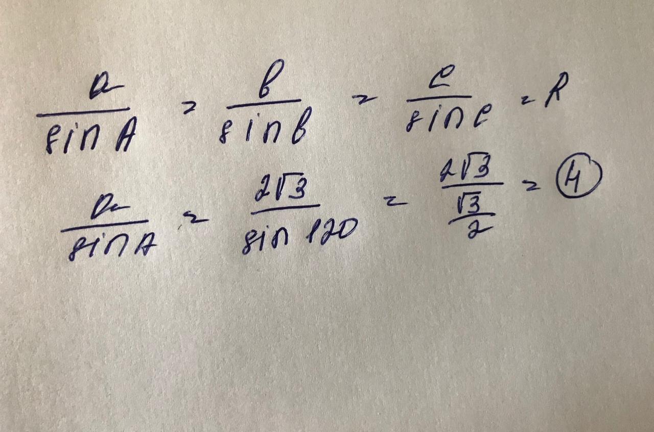 в треугольнике abc сторона ав равна 2 корень из 3 угол с равен 120 найдите радиус описанной окружности около этого треугольника окружности
