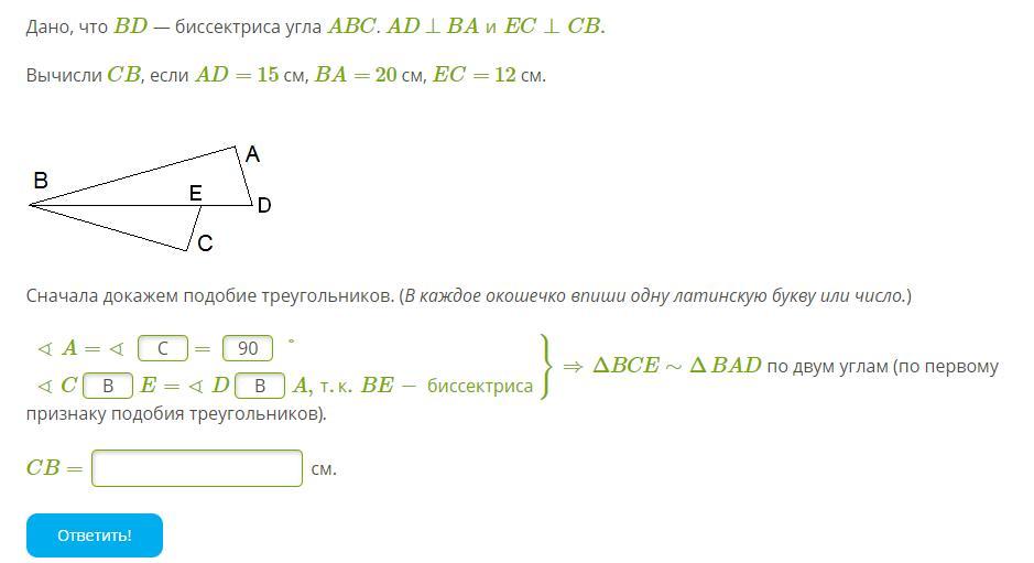 Вычисли CB, если AD= 15 см, BA= 20 см, EC= 12 см.