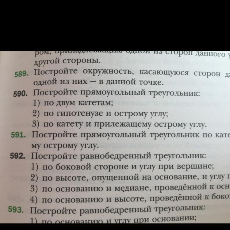 Постройте прямоугольный треугольник: 1) по двум катетам; 2) по гипотенузе и острому углу; 3) по катету и прилежащему острому углу.