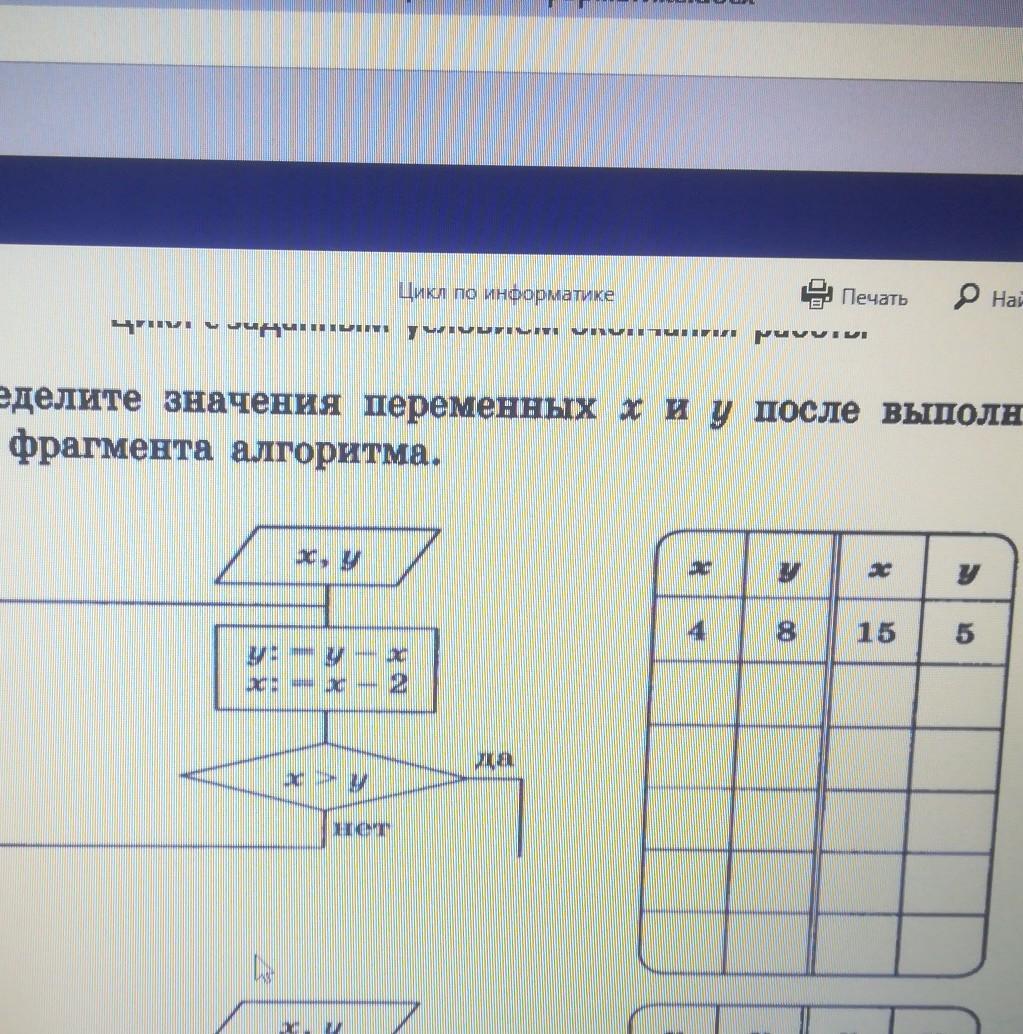 Определите значения переменных х и у после выполнения фрагмента алгоритма ​