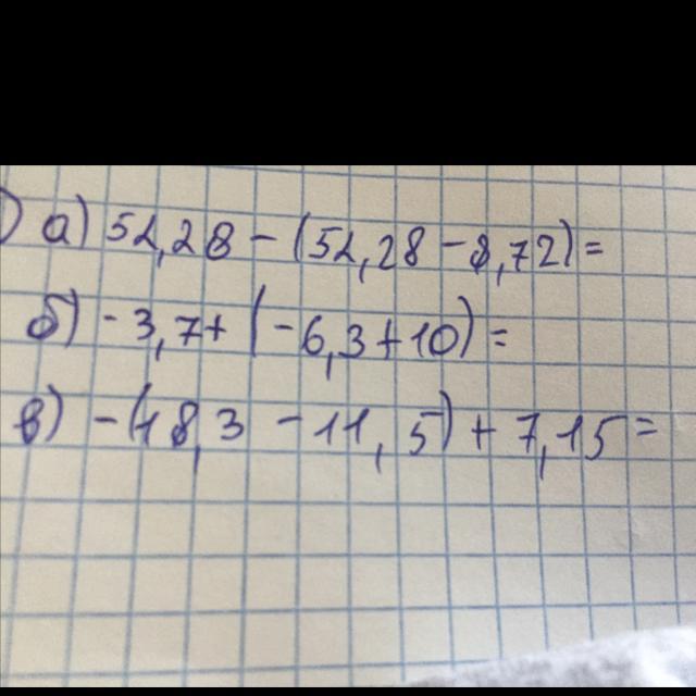 б) - 3,7 + ( - 6,3 + 10 ) = - 3,7 + 3,7 = 0