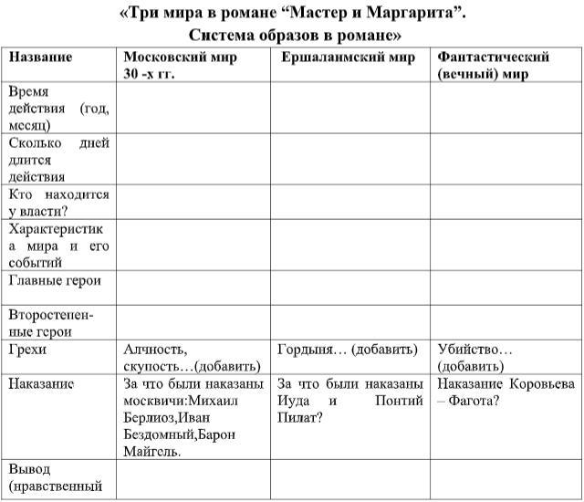 Помогите пожалуйста с таблицей по литературе, по роману "Мастер и Маргарита"