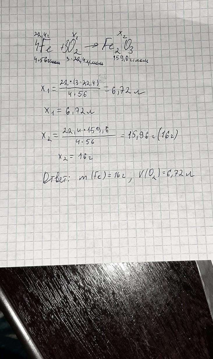 Вычислите массу в граммах оксида железа(3),полученного при сжигании 22,4 граммов железа (Fe)?Какой объем кислорода (О2) при н.у. потребовался для горения этого железа?