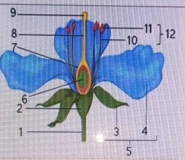 1-цветоножка, 2-цветоложе, 3-чашелистик, 4-лепесток, 5-околоцветник, 6-семязачаток, 7-завязь, 8-столбик, 9-рыльце, 10-тычиночная нить, 11-пыльник, 12-тычинка.