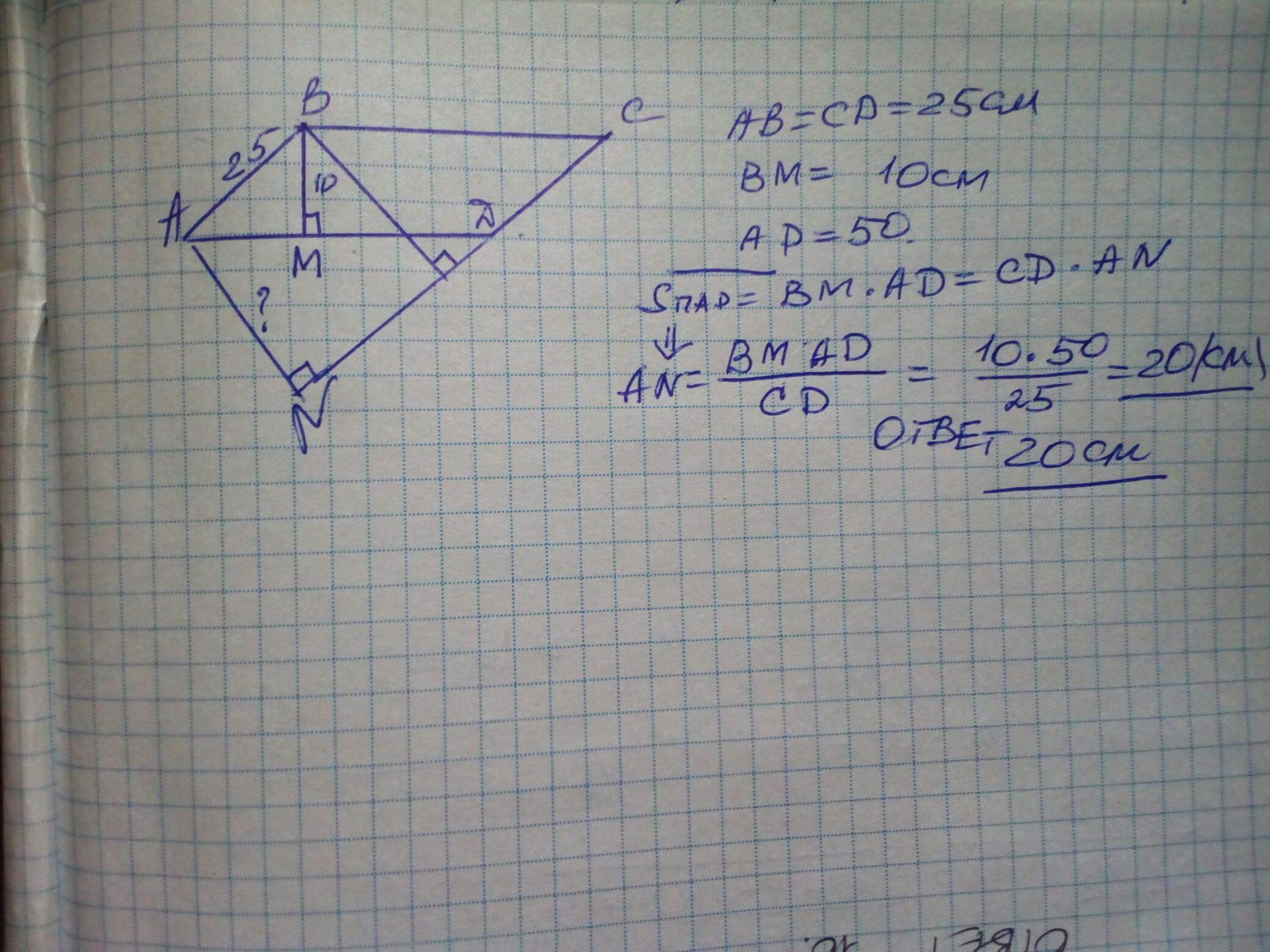 у паралелограмі АВСD проведена висота ВМ до сторони АD і висота AN до сторони CD.Знайдіть висоту паралелограмі AN якщо AB=25 см,BM=10 см ,AD=50 см