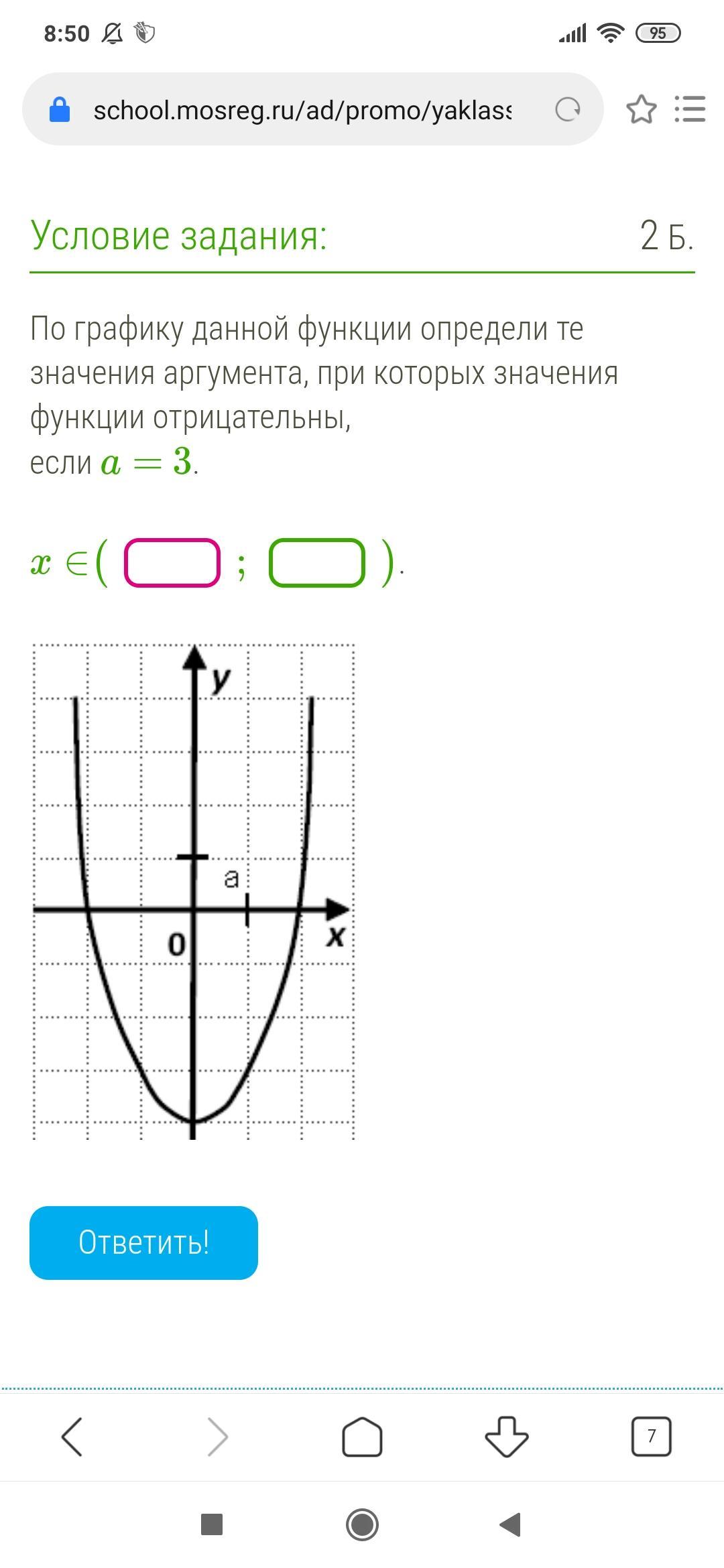 По графику данной функции определи те значения аргумента, при которых значения функции отрицательны,