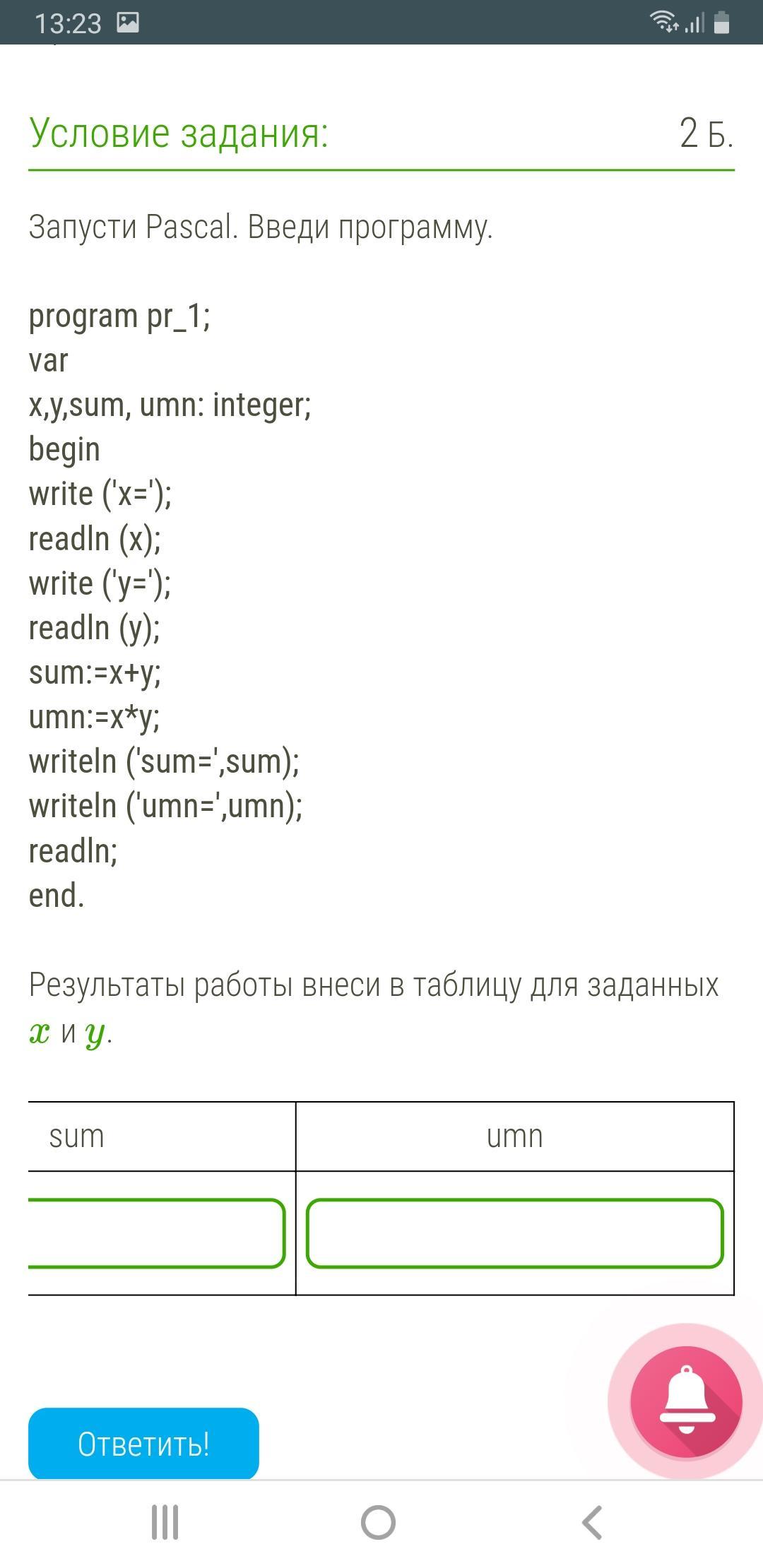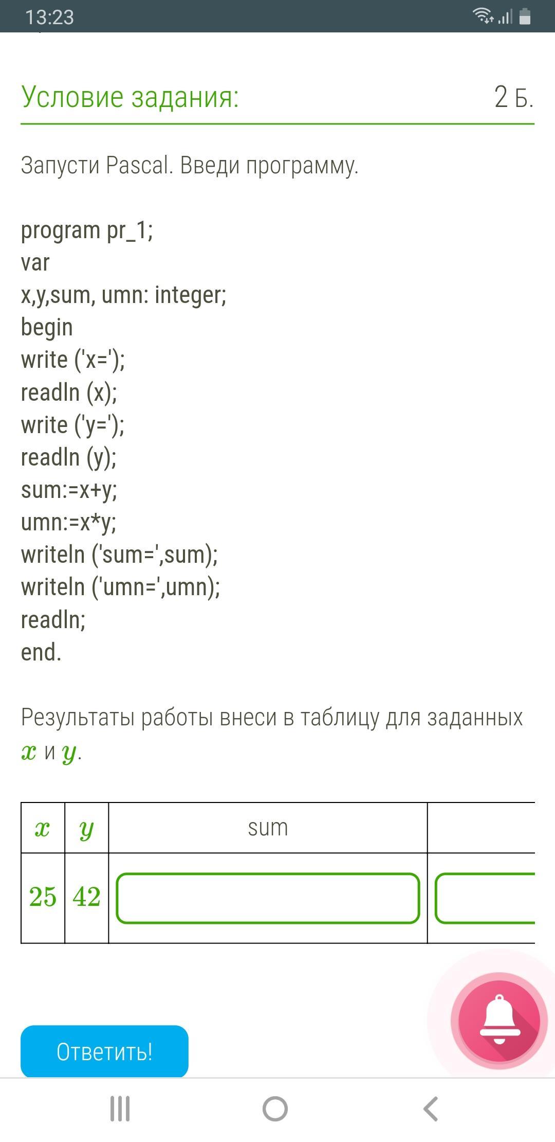 Поскольку в коде прописано sum:=x+y, то просто значение x и y надо сложить.