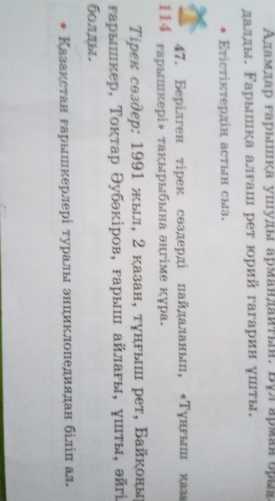 Ответ:Тоқтар Әубәкіров 19991 жылы 2 қазанда тұңғыш рет Байқоңырдан ғарыш айлаға ұшты.Біздің мақтанышымыз Тоқтар Әубәкіров тұңғыш ғарышқа ұшып әйгілі болды.ч
