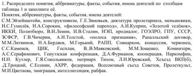 Распределите понятия, аббревиатуры, факты, события, имена деятелей по столбцам