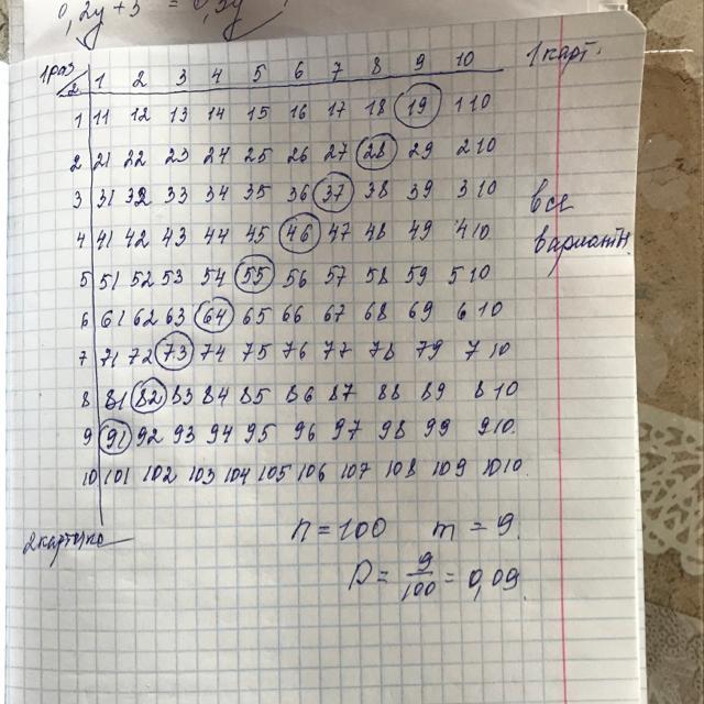 На отдельных карточках написаны числа от 1 до 10, каждое 1 раз. Жанна наугад вытаскивает две карточки. Какова вероятность того, что сумма чисел на вытащенных карточках будет равна 10?