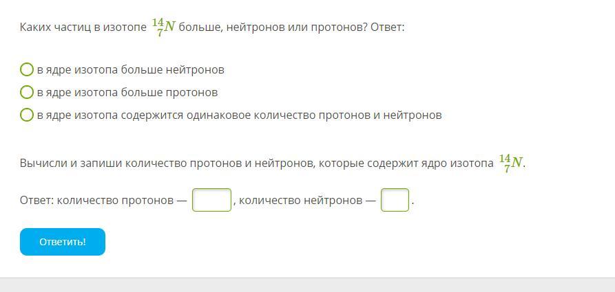 Вычисли и запиши количество протонов и нейтронов, которые содержит ядро изотопа N714.