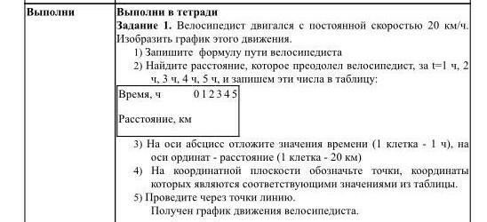 2)Н Найдите растояние, которое преодолел велосипедист, за t=1 ,2 ,3 ,4 ,5 часа и запишем эти числа в таблицу.