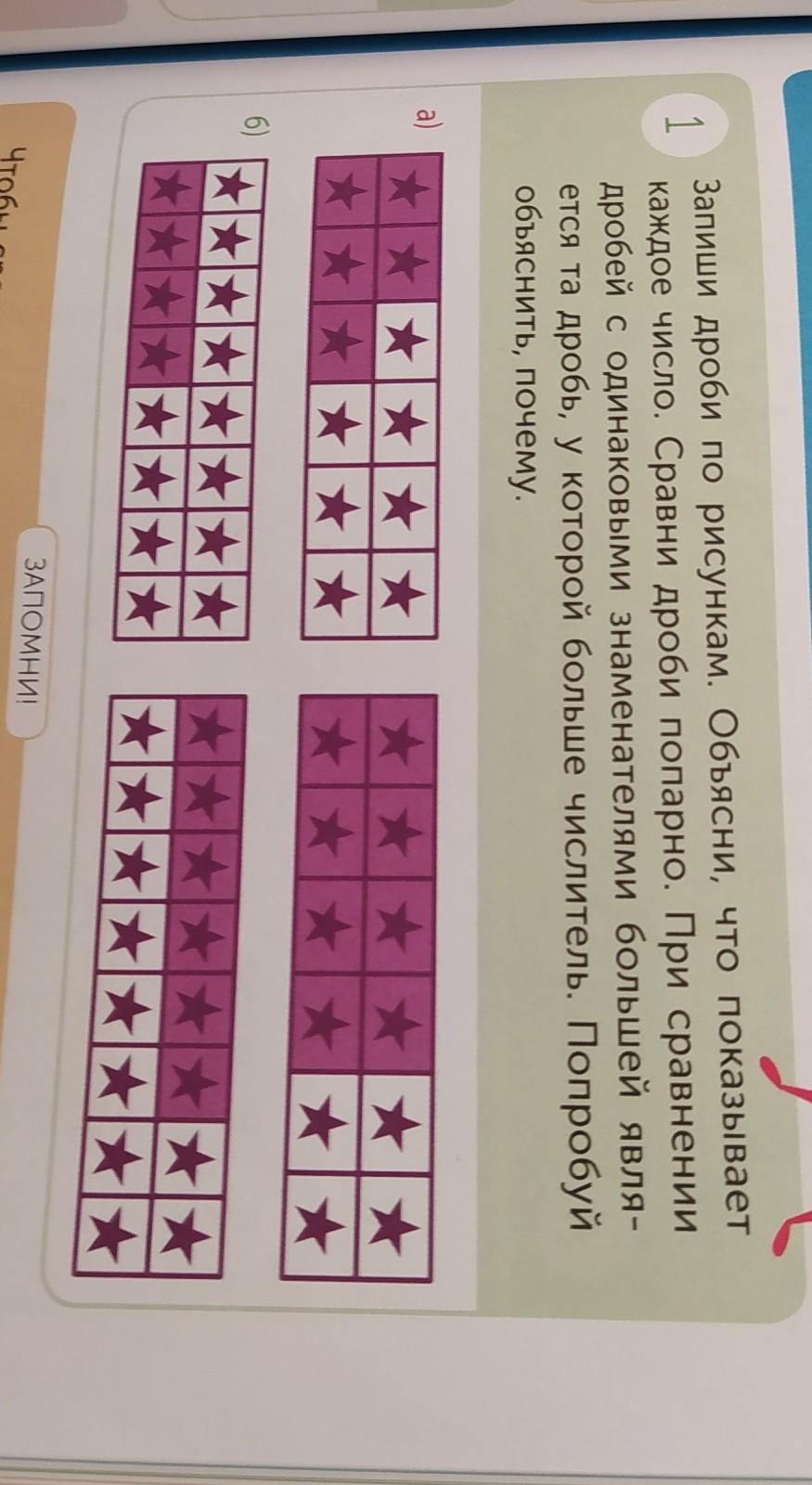 Запиши дроби по рисункам.Объясни,что показывает каждое число.Сравни дроби попарно.При сравнении дробей с одинаковыми знаменателями большей является та дробь,у которой больше числитель.Попробуй объяснить почему.