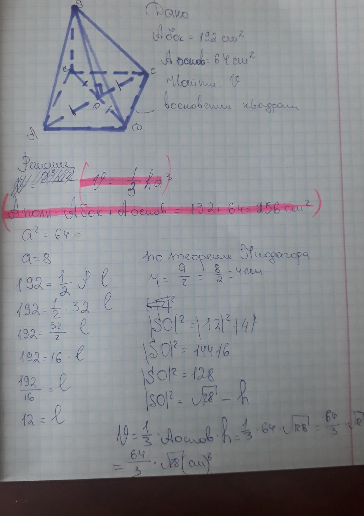 Площадь боковой поверхности правильной четырехугольной пирамиды равна 192 см^2,а площадь основания 64 см^2.Определите объем этой пирамиды.