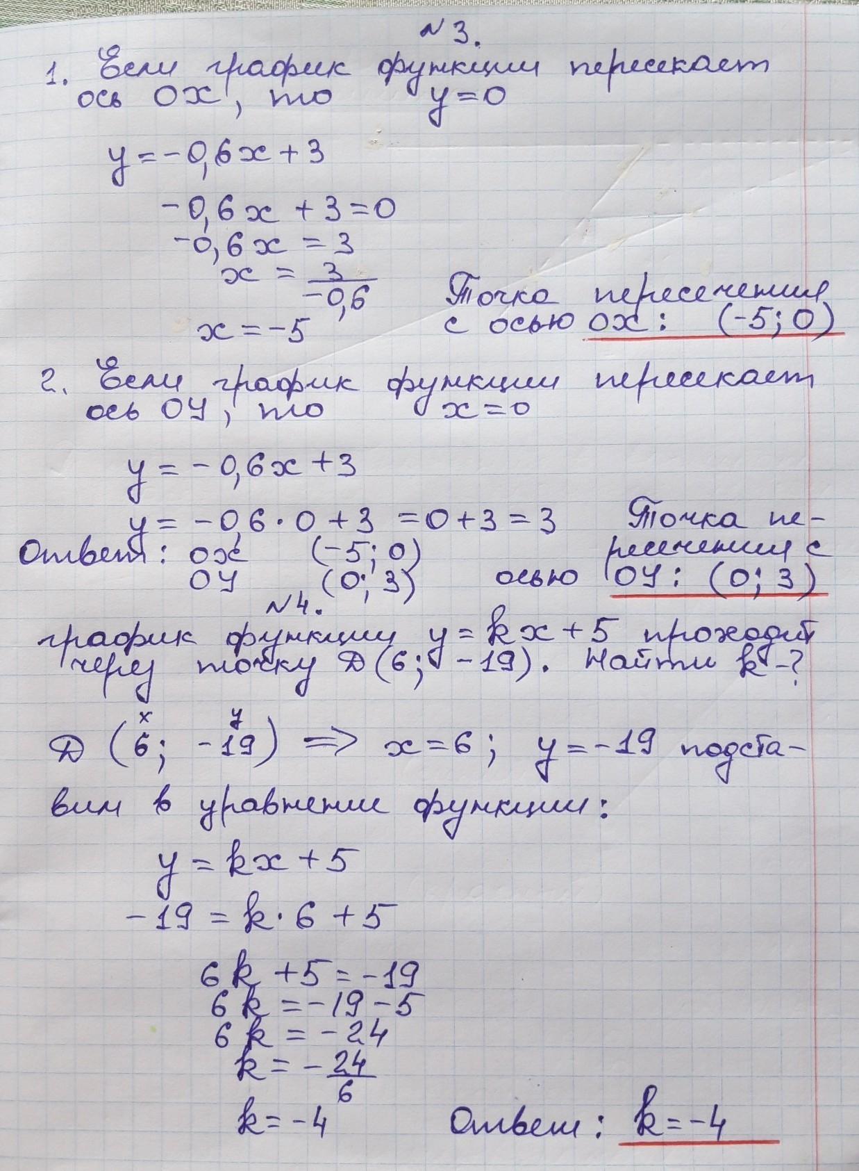 Не выполняя построения, найдите координаты точек пересечения графика функции y = -0,6x + 3 с осями