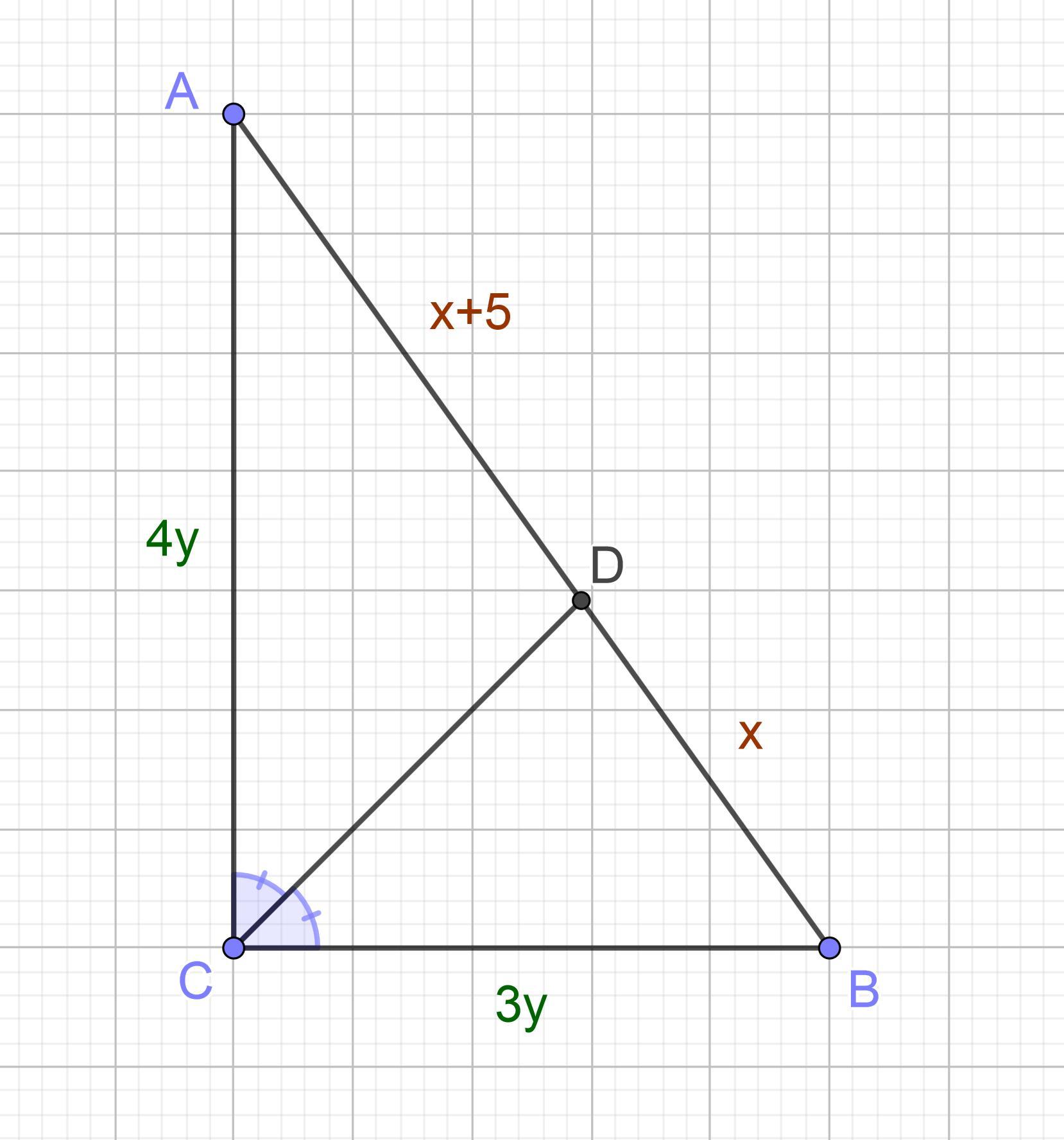 Пусть дан ΔABC, ∠C = 90°, CD — биссектриса. Исходя из условия задачи, обозначим длины отрезков AD за x+5 (см), BD за x (см), AC за 4y (см), BC за 3y (см).