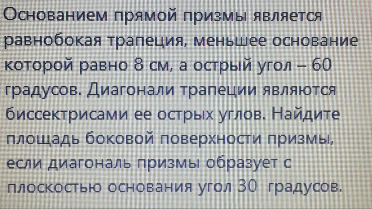 Дано: АВСМА₁В₁С₁М₁- прямая призма, Основание призмы АВСМ- трапеция АВ=СМ, ∠ВАМ=60°, АС, ВМ-биссектрисы, ВС=8 см.