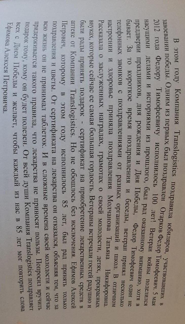 осн мысль:компания Translogistics оказала помощь ветеранам Великой отечественной войны и в качестве поощрения наградила сертификатами,благодаря которым,они смогут