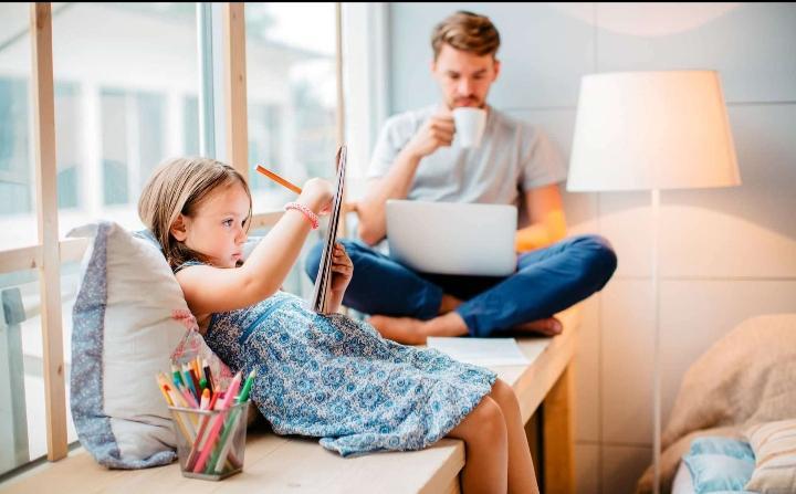It is a very sweet picture for me.I see a girl.She draws something on the paper.To the left I see her dad.He is very busy.He is having tea.I liked this picture