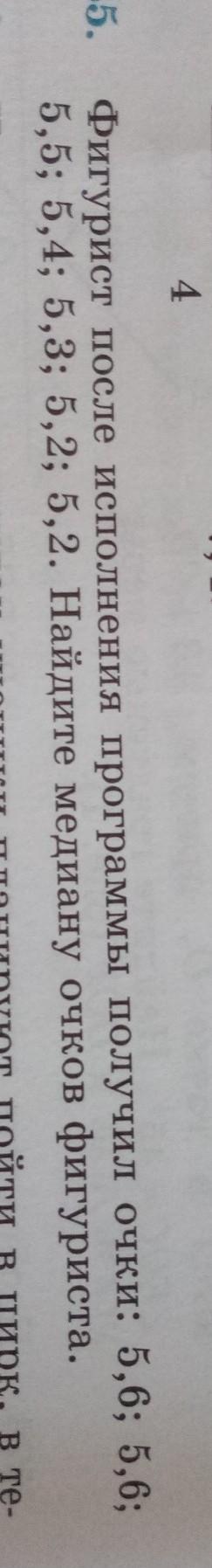 Фигурист после исполнения программы получил очки:5,6;5,6;5,5;5,4;5,3;5,2;5,2.Найдите медиану очков фигуриста.