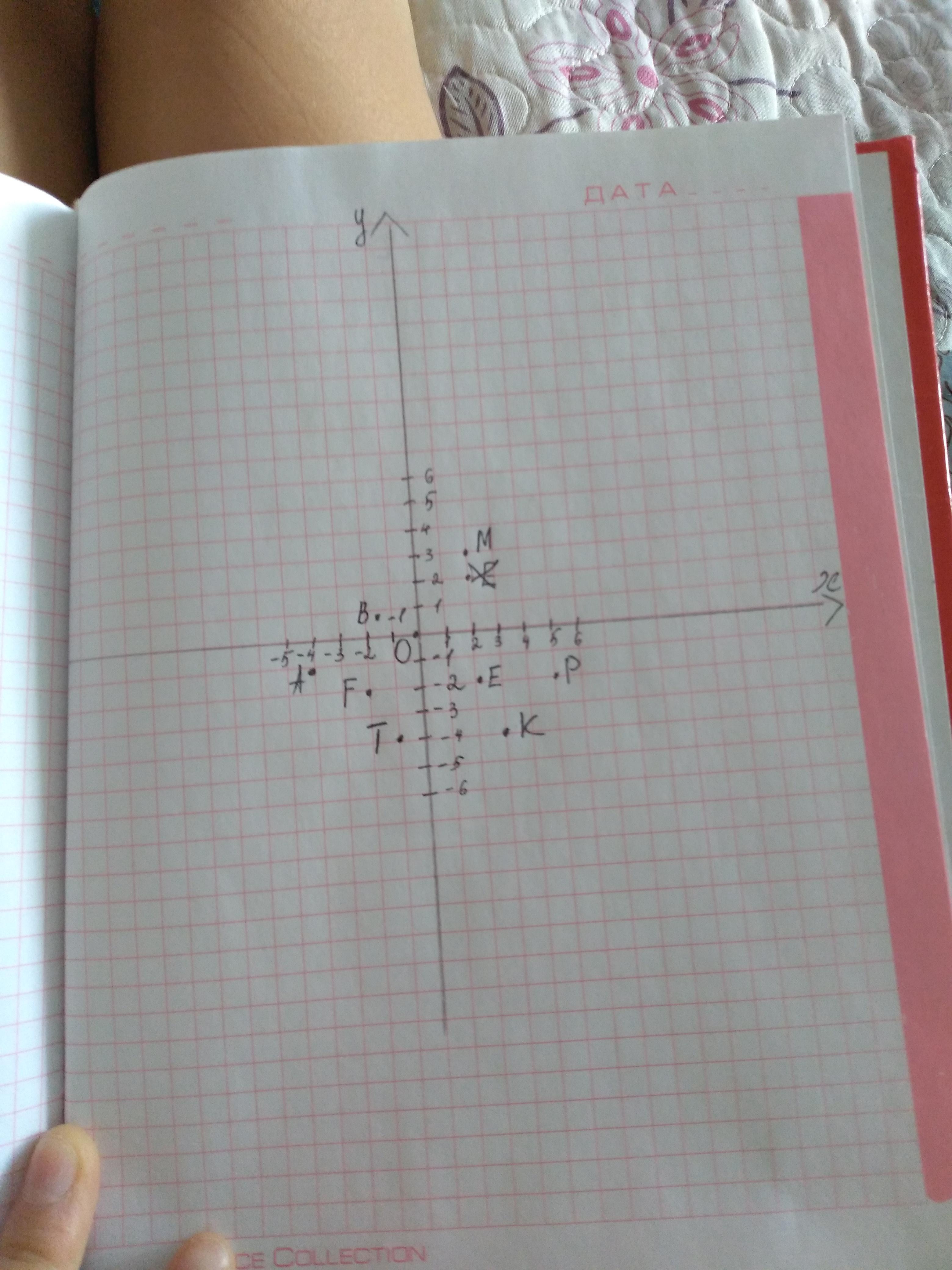 Отметьте на координатной плоскости точки М (2; 3), K(-4; 3), P(5; -2), E (2; -2), F(-2; -2), T(-4; 0), A (0; -4), B (4; 0).