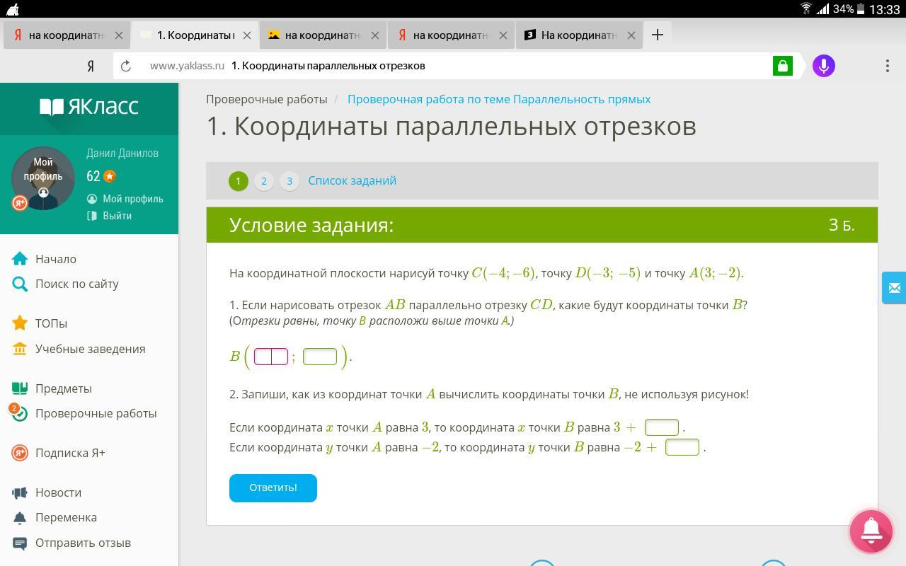 1. Если нарисовать отрезок AB параллельно отрезку CD, какие будут координаты точки B?