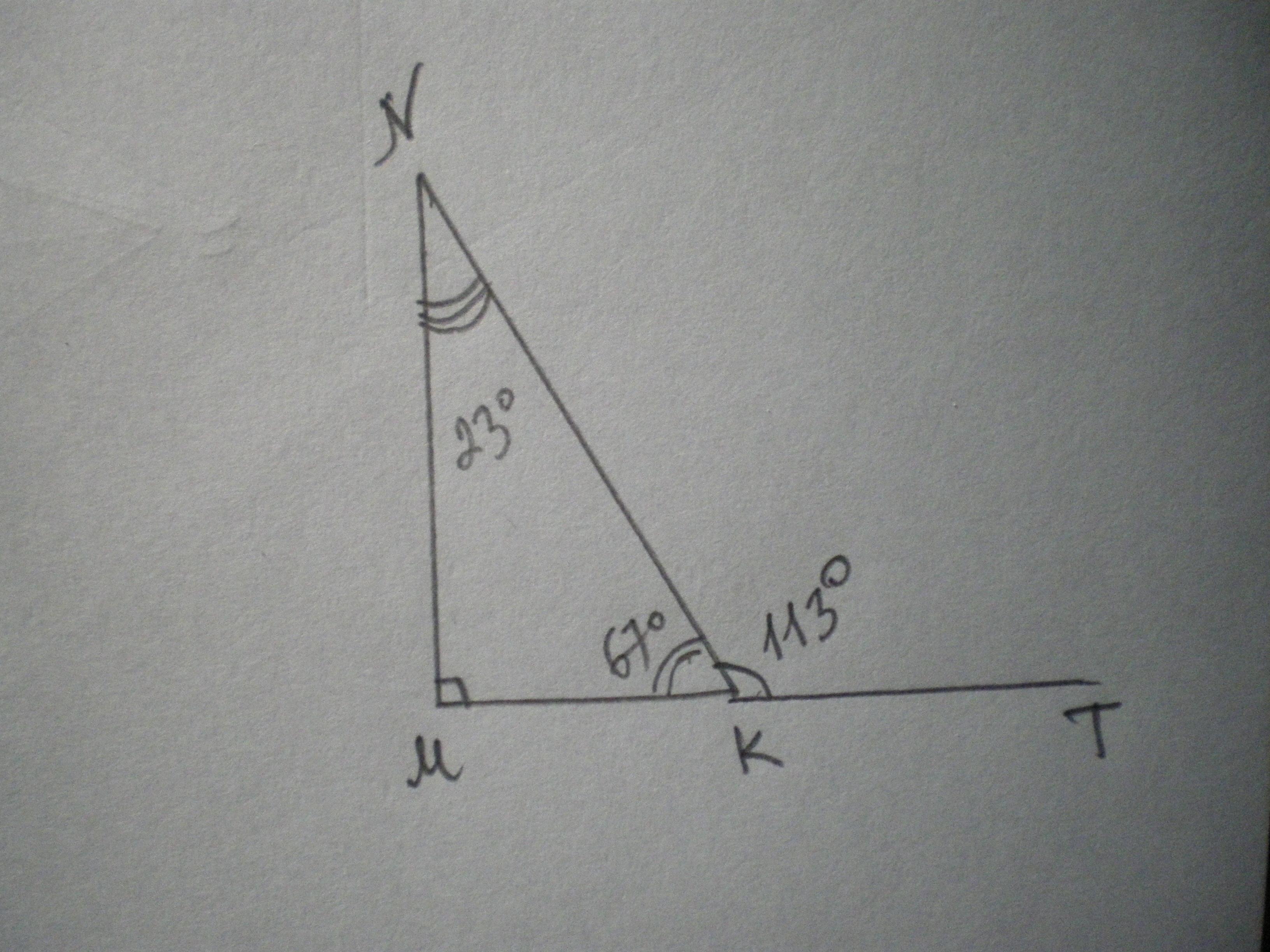 ∡ N = 90°-67°=23°, т.к. сумма острых углов прямоугольного треугольника составляет 90°