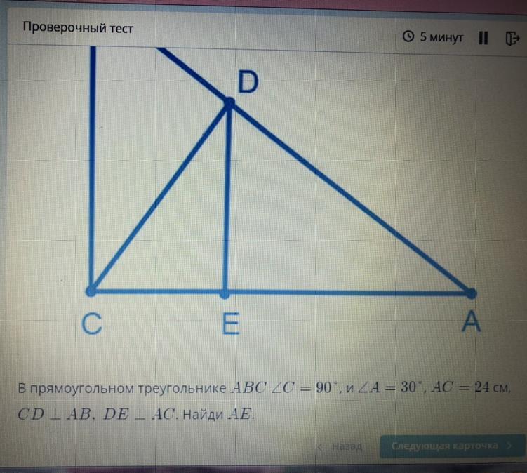 AC является гипотенузой треугольника АСD, по свойства катета мы узнаем что сторона СD будет 12см. сторона CD является гипотенузой треугольника СЕD, соответственно сторона СЕ будет равна 6 см. 24-6=18 см.