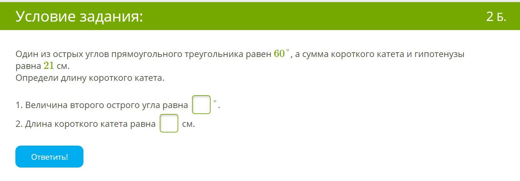 Один из острых углов прямоугольного треугольника равен 60°, а сумма короткого катета и гипотенузы равна 21 см.
