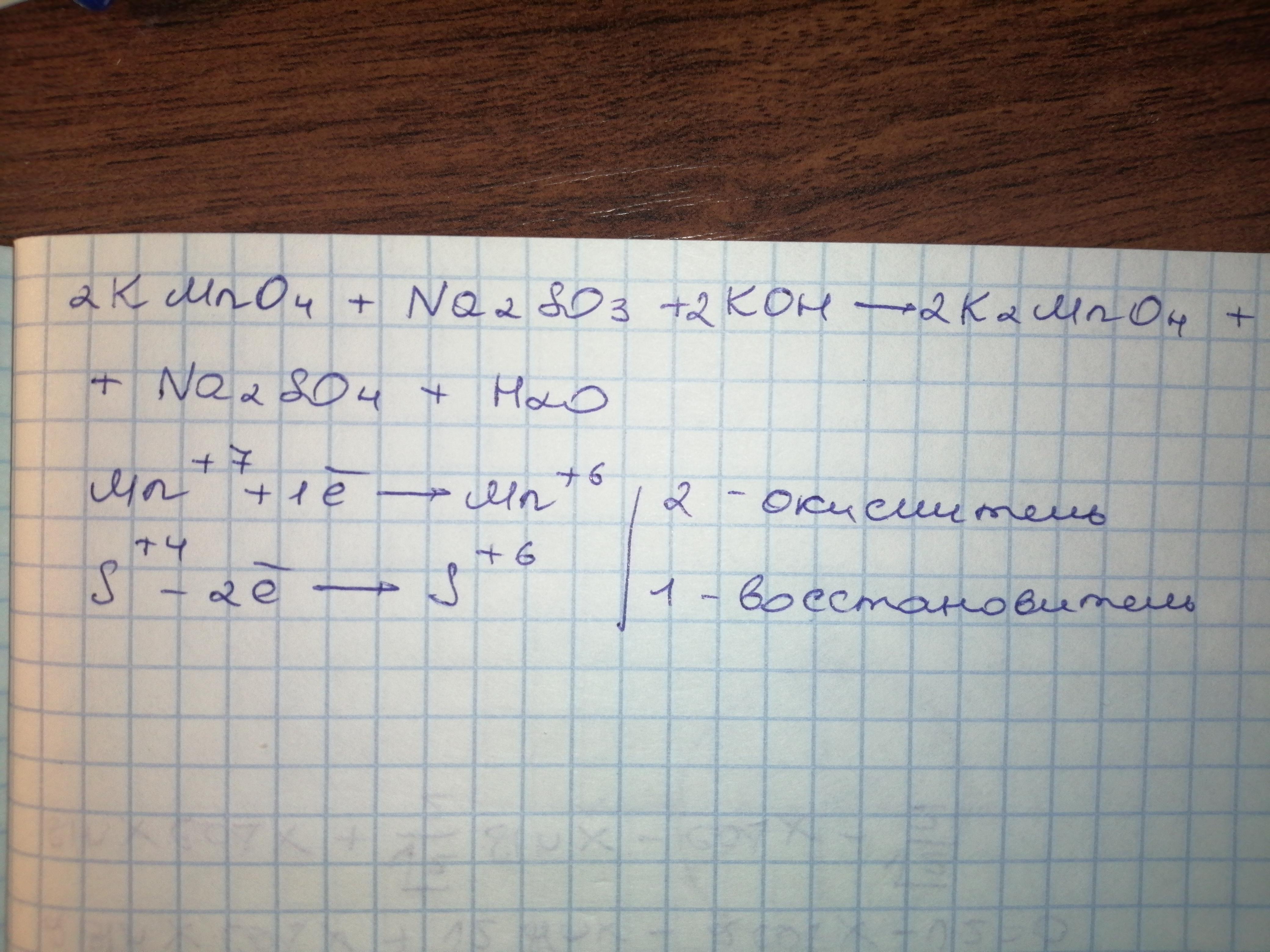 Для выполнения задания используйте следующий перечень веществ: перманганат калия, гидрокарбонат калия, сульфит натрия, сульфат бария, гидроксид калия. Допустимо использование водных растворов веществ. Из предложенного перечня веществ выберите вещества, между которыми возможна окислительно -восстановительная реакция, и запишите уравнение этой реакции. Составьте электронный баланс, укажите окислитель и восстановитель.