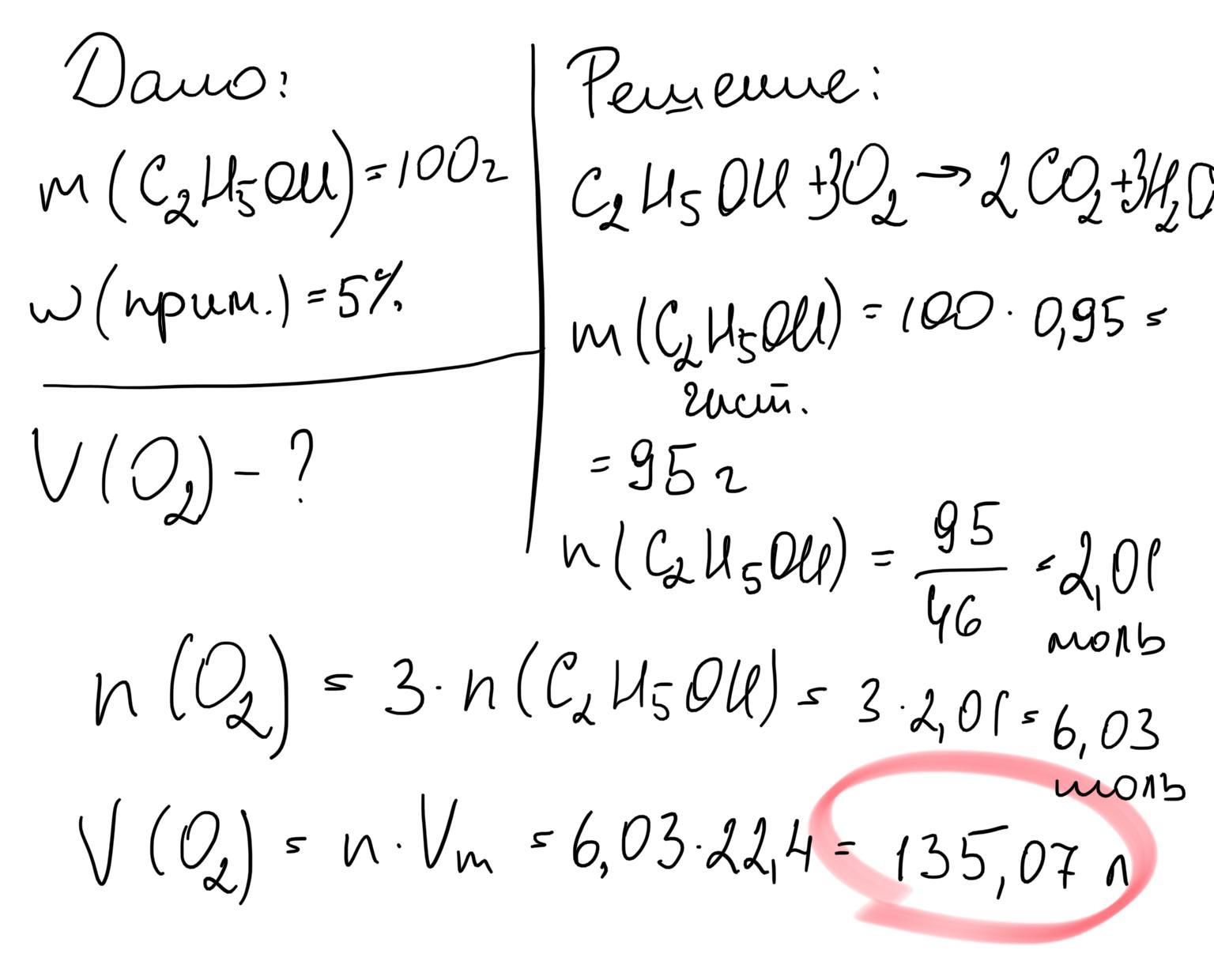 Какой объем кислорода расходуется на сжигание 100 г этанола, содержащего 5 % примесей . помогите решить и оформить задачу, с дано, решение и тд.)))